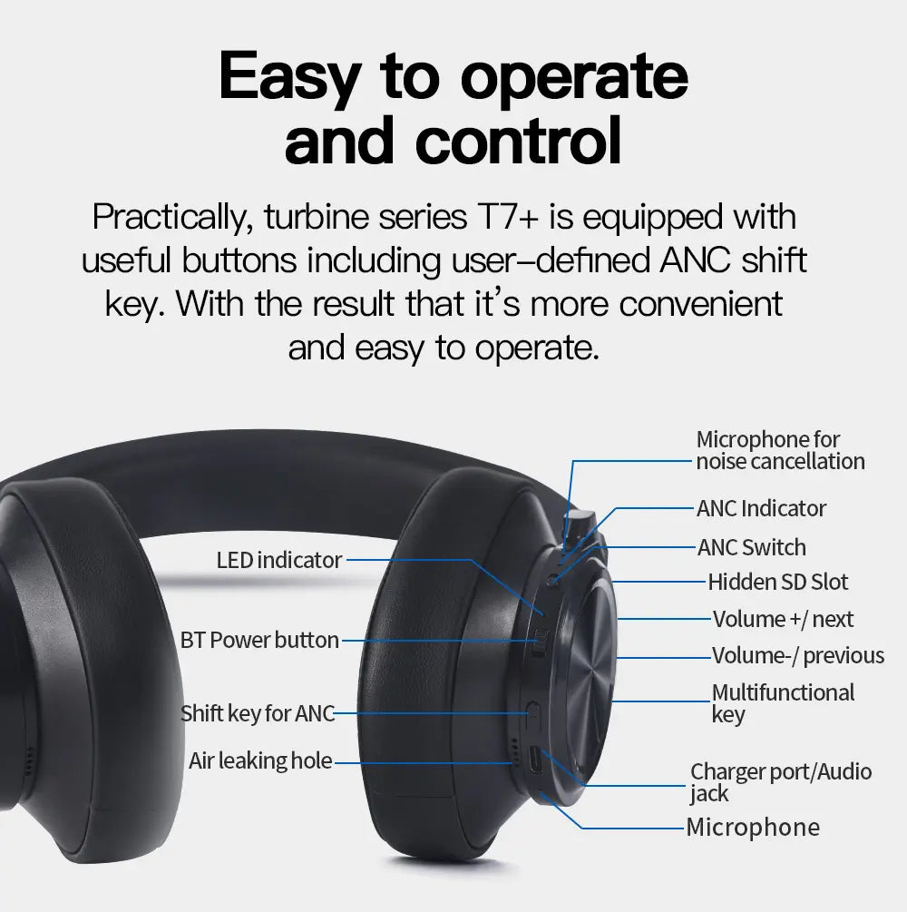 - Auriculares inalámbricos y con cable y 30 horas de tiempo de reproducción prolongada: la batería integrada proporciona hasta 30 horas de tiempo de música o tiempo de conversación. No hay necesidad de preocuparse por el problema de la escasez de energía en los viajes largos. Bluedio T7 plus se convierte en un auricular con cable mediante el cable de audio incluido. Consejos: para ahorrar energía, apaga ANC cuando no esté en uso.