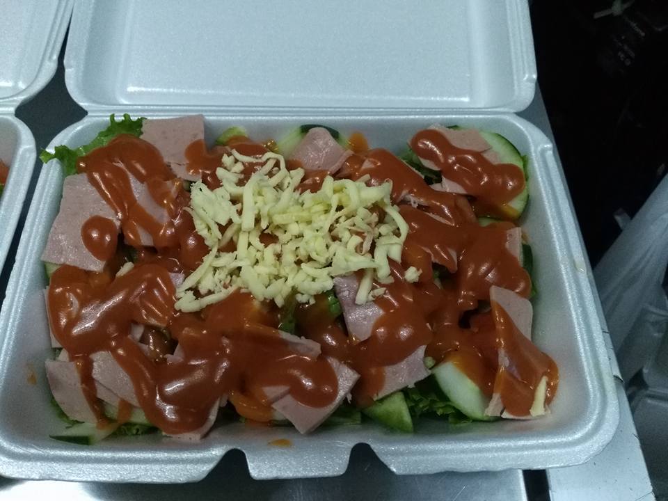 Lechuga, tomate, pepino, chile, cebolla, jamón, aderezo, queso mozzarella.