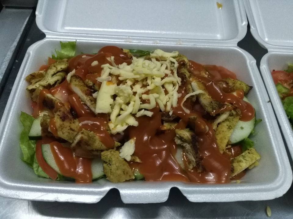Lechuga, tomate, pepino, chile, cebolla, pollo, aderezo, queso mozzarella.