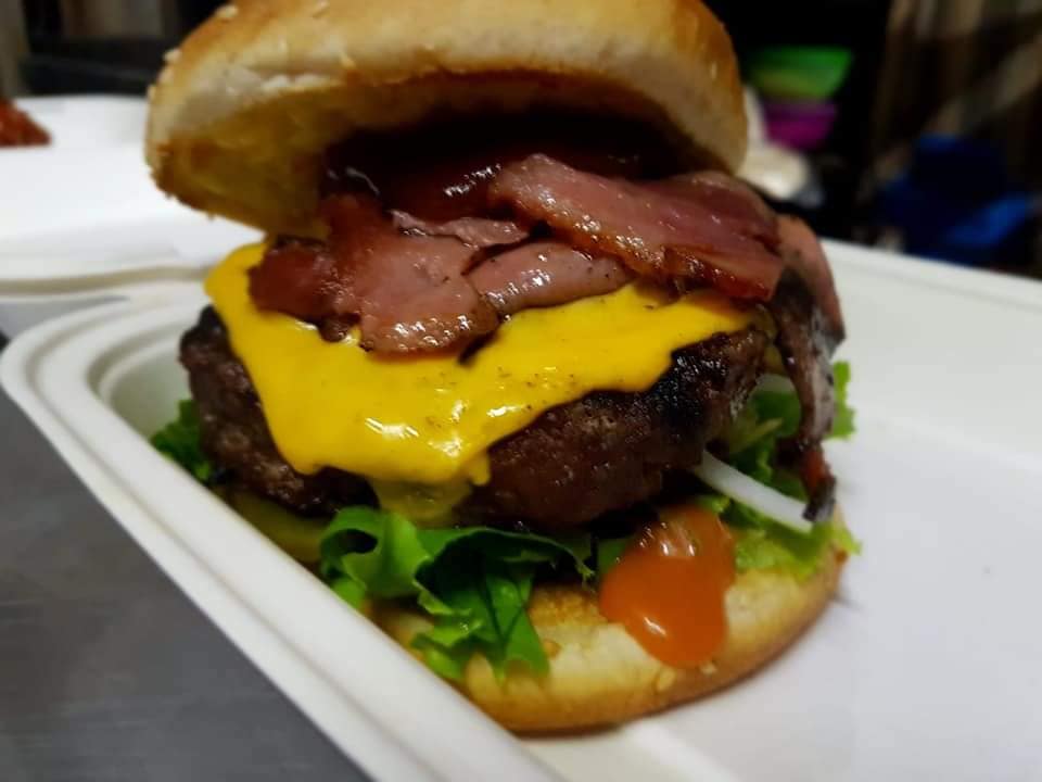 Deliciosa torta de res angus 1/2 libra o pollo empanizado (200g), queso mozzarella, queso americano, lechuga, cebolla, tomate, aderezo. jamón. tocineta y salsa BBQ.